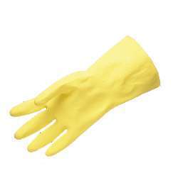 Yellow natural latex gloves, 18 mil, flocklined, embossed grip on palm and fingers, 12” length. Available in sizes Small – Extra-Large.